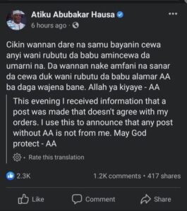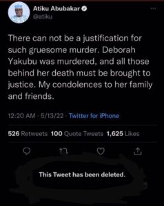 After the unlawful killing of Deborah in Zamfara, Atiku tweeted to condemn the act on his Twitter account. After some time, the tweet was deleted.