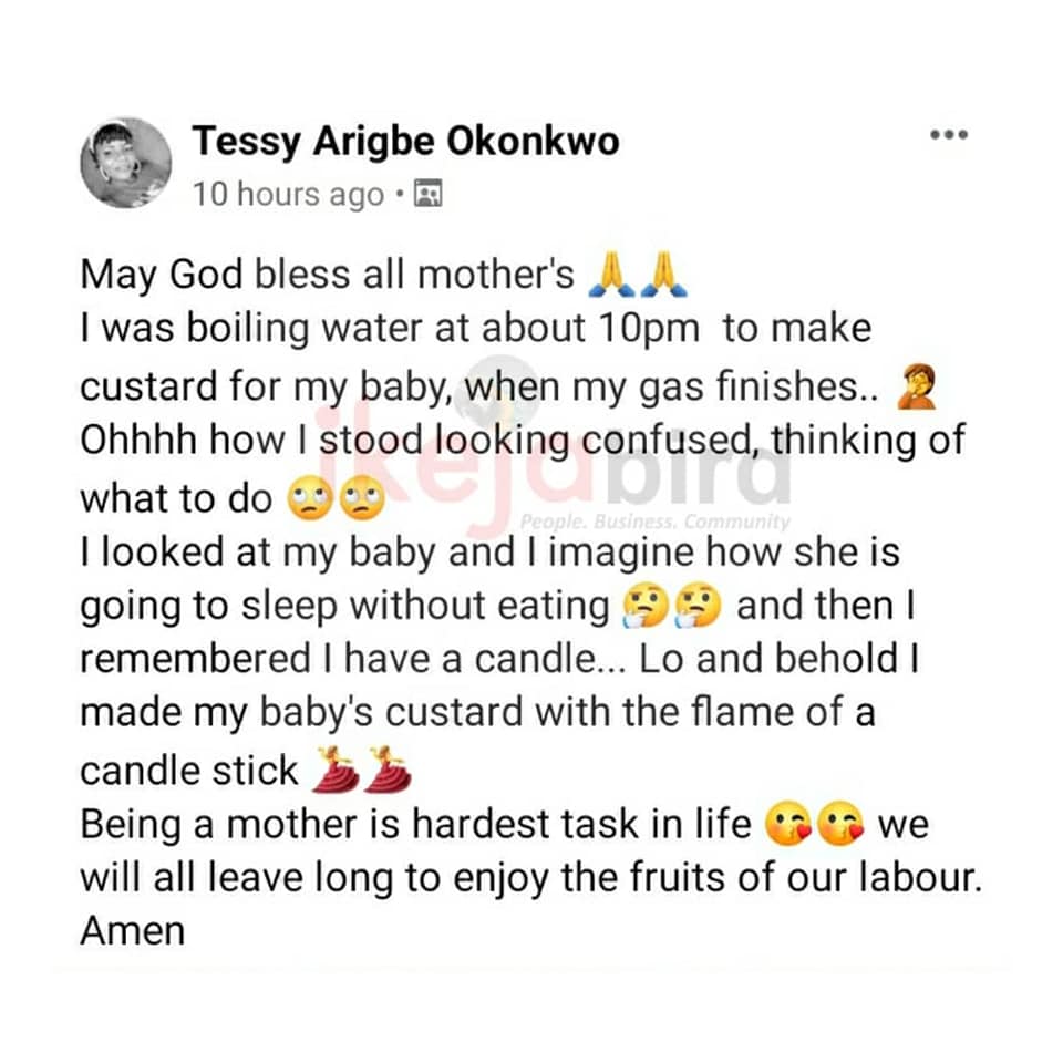 UncategorizedBeing a mother is hardest task October 13, 2021October 13, 2021 - by Ikejabird - Leave a Comment Woman narrates how she was able think out a way to feed her baby after her gas finished at night. Recommended posts: The impact of the hike in cooking gas price Is a woman worthless if she can’t cook? PETROAN: LPG is produced in Nigeria, yet the country buys cooking gas at international price. Iconic Shots from the #EndSARS #endpolicebrutality Protests