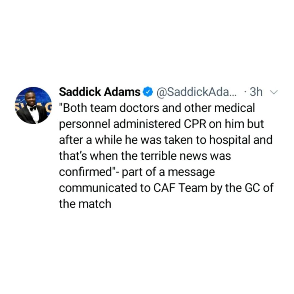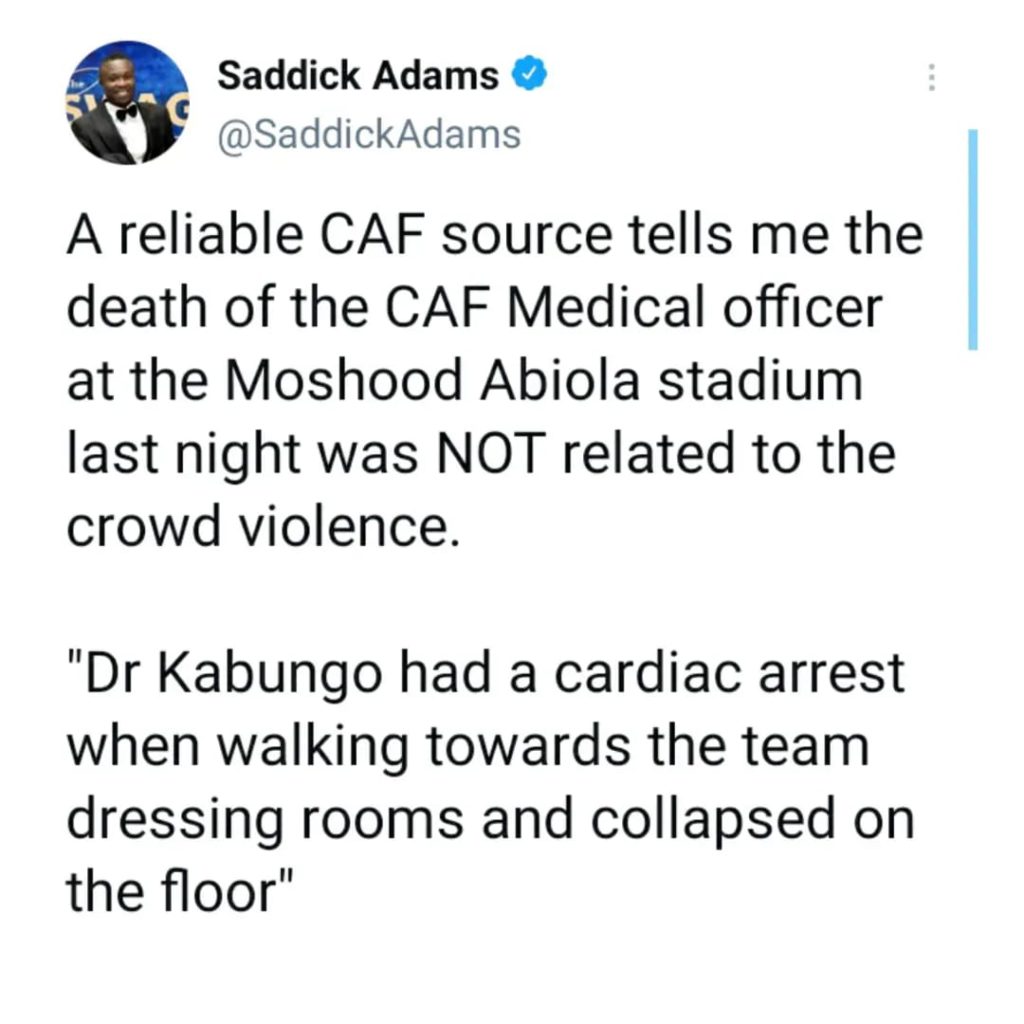 A medical practitioner from Zambia, Dr. Joseph Kabungo, who was working as the CAF/FIFA Medical Officer at the Nigeria vs Ghana game in Abuja yesterday slumps and dies.