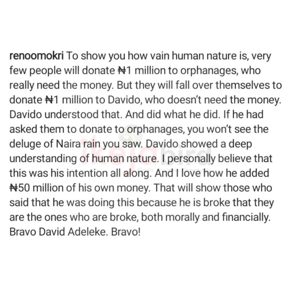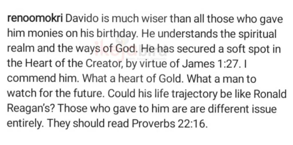 EntertainmentDavido is much wiser than all those who gave him monies in his birthday – Reno Omokri November 20, 2021November 20, 2021 - by Ikejabird - Leave a Comment Recommended posts: Davido gives out 200 million naira gotten from his donations by friends to orphanages to mark birthday. Former aide to ex-president Goodluck Jonathan, Reno Omokri reveals where Nnamdi Kanu was arrested. Stop allowing people affect you like a remote control – Reno Omokri Discipline your mind from negative realities – Reno Omokri