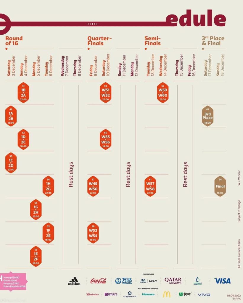 SportsFIFA releases World Cup match schedule for November April 2, 2022April 2, 2022 - by Ikejabird - Leave a Comment Which dates are you marking in your diary?? Recommended posts: Angry Fans vandalize facilities at the MKO stadium in Abuja after Nigeria loses to Ghana for the FIFA WORLD CUP in Quatar FIFA WORLD CUP GROUPS ARE SET Woman Crush Wednesday: Funke Akindele-Bello Davido becomes the first African artiste to get featured on the FIFA world cup soundtrack for #qatar2022