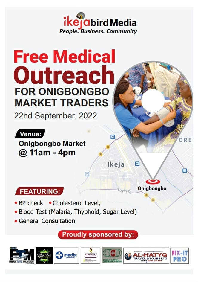Hot TopicsFree Medical Outreach for Onigbongbo Market Traders organised by IkejaBird Media. September 21, 2022September 23, 2022 - by Ikejabird - Leave a Comment Proudly Sponsored by: @carefulclinicaldiagnosisltd @medix_pharmacy01 @al_hatyqtravel_online @freeflytravels @blackmaskbittersng @adufee27 @fixitprong Recommended posts: Onigbongbo Market Traders Lament over continuous increase in Price A walk with Iyaloja, Onigbongbo market, Maryland. Price of food stuffs in Onigbongbo Market, Maryland Tips you should know if you want to rent a shop in Onigbongbo Market.