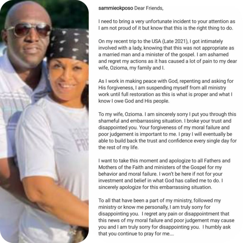 Gospel artiste, Sammie Okposo deletes Instagram and twitter account over cheating scandals.