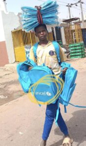 The UNICEF material he spoke about was a sky blue bag with the organization’s name written boldly on it.