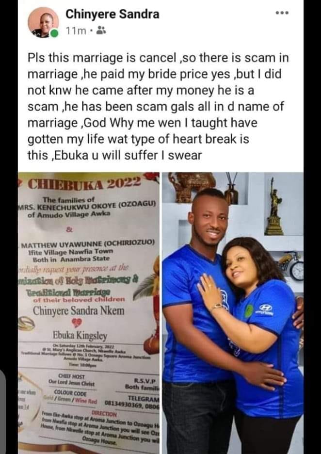 UncategorizedHe came after my money, he is a scam – Woman desolves her marriage few days after her wedding. January 26, 2022January 26, 2022 - by Ikejabird - Leave a Comment Recommended posts: Nigerians are good teachers 👏 Whites seen spraying money at a wedding. Three years after marriage, I found out my husband is gay – Nigerian woman burst into tears. Cryptos not scam. Marriage is hard work – Prettymikeoflagos