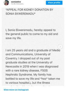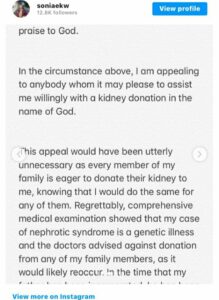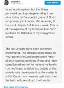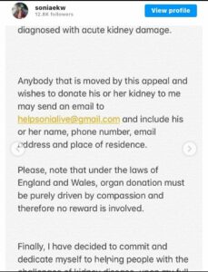She claims this has affected her family in numerous ways as she remains at the United Kingdom hospital. She further said on her Instagram page that she needs a donor as soon as possible.
