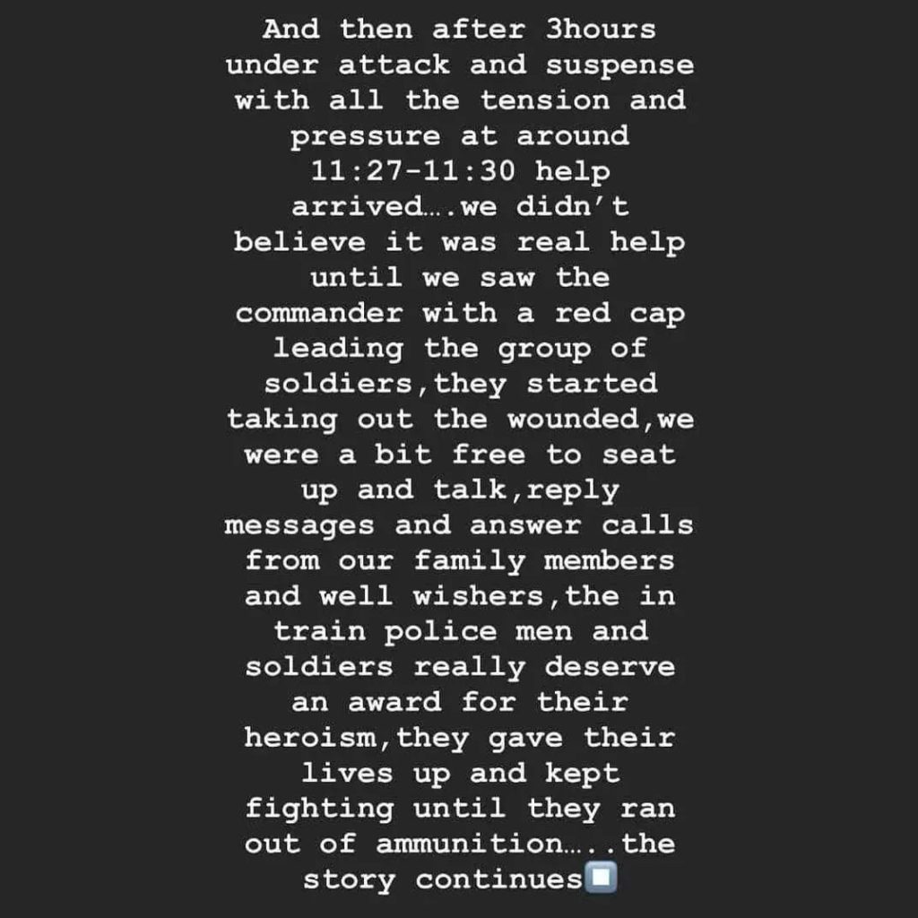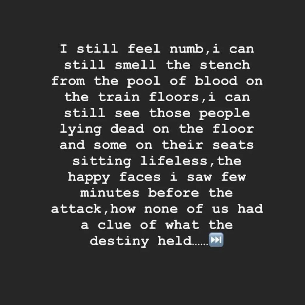 Hot Topics / Metro + CrimeKaduna train attack: Woman narrates terrifying moments April 2, 2022April 2, 2022 - by Ikejabird - Leave a Comment Recommended posts: Tinubu cancels 70th birthday celebration over Kaduna train attack Terror Attack: Nigerians still searching for their family members who were on the Abuja-Kaduna train Aftermath of the attack on Abuja-Kaduna bound train few hours ago Dr. Chinelo was a victim of yesterday’s train attack in Kaduna.