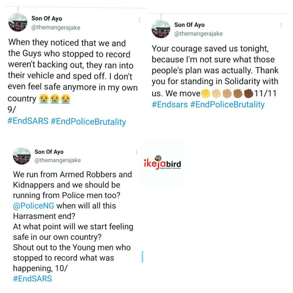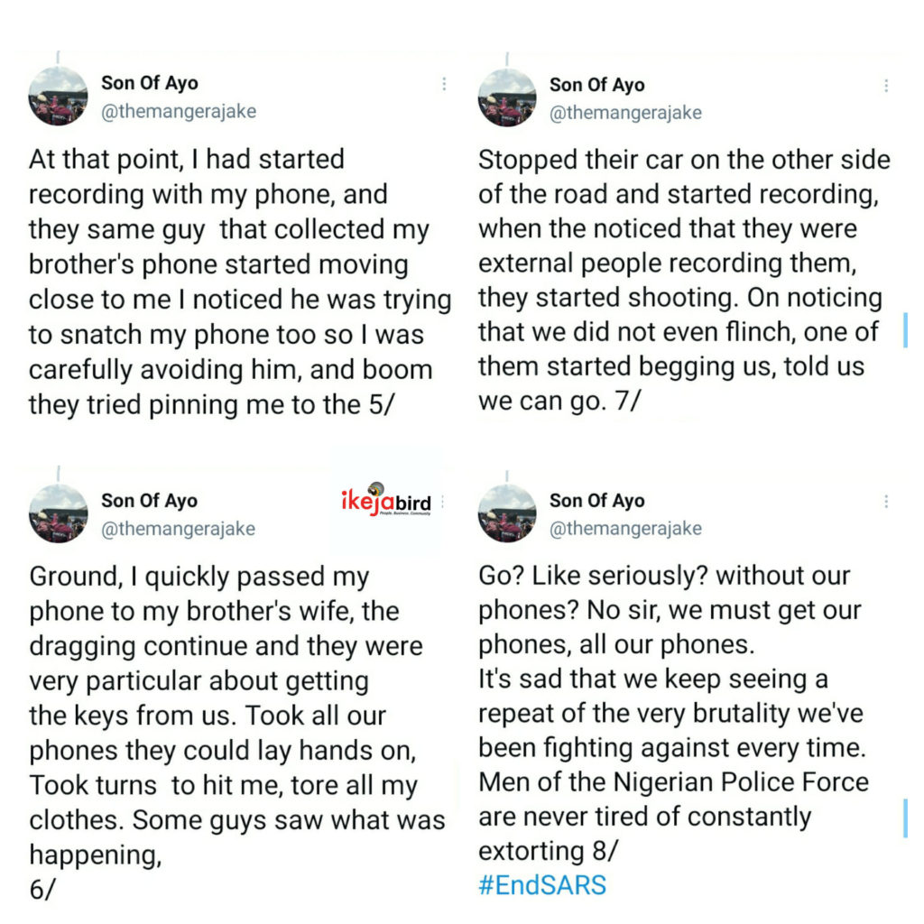 Metro + CrimeMan narrates encounter with some policemen who wanted to extort them. November 23, 2021November 23, 2021 - by Ikejabird - Leave a Comment Recommended posts: Traveller narrates his encounter with IPOB ESN members over violation of sit at home order. Man narrates a robbery incident, he witnessed on Eko bridge, Lagos. Man narrates ordeal after escaping bandits attack in Sokoto. DSS declares Sunday Igboho Wanted.
