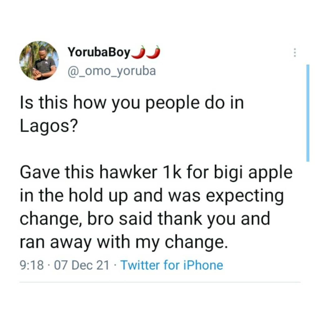 Metro + CrimeMan narrates how a roadside hawker gratefully ranaway with his change. December 8, 2021December 8, 2021 - by Ikejabird - Leave a Comment Recommended posts: Man narrates a robbery incident, he witnessed on Eko bridge, Lagos. Man narrates encounter with some policemen who wanted to extort them. Video: Man narrates encounter with some policemen who wanted to extort them. Man narrates how he was assaulted at Lagos traffic in Ikeja by Soldiers.