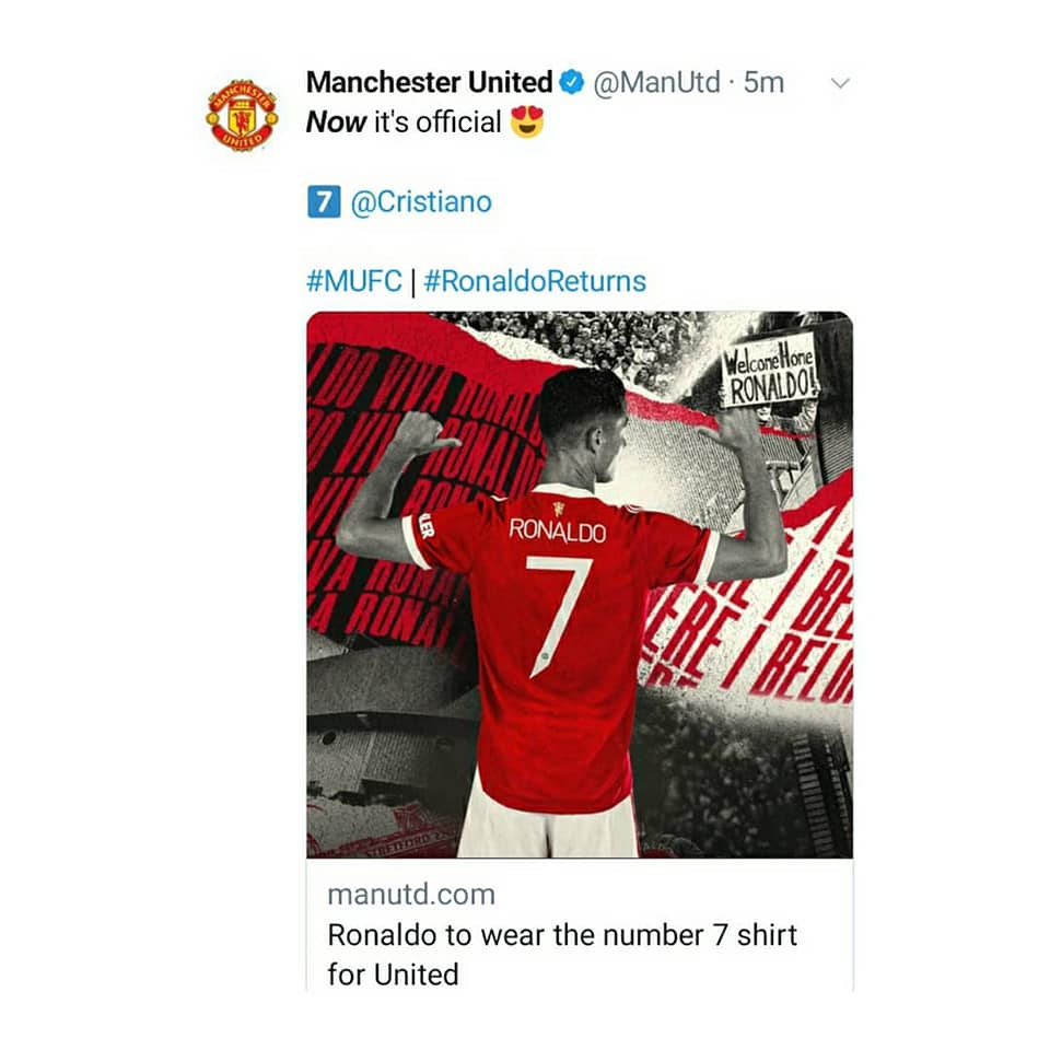 SportsManchester United confirms that Cristiano Ronaldo will be wearing the number 7 shirt again. September 3, 2021October 25, 2021 - by Ikejabird - Leave a Comment Recommended posts: Cristiano Ronaldo Set To Wear Number 7 Shirt at Manchester United Cristiano Ronaldo breaks shirt sale records just 24 hours after no.7 announcement.. Transfer deal: Ronaldo returns to Manchester United. Manchester United releases photos of Ronaldo in new team kit.