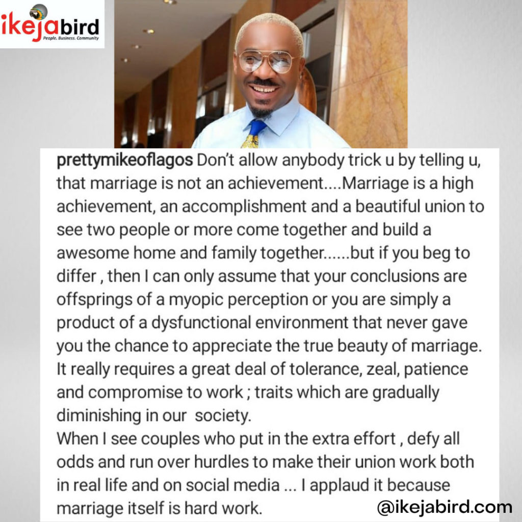 UncategorizedMarriage is hard work – Prettymikeoflagos October 10, 2021December 14, 2021 - by Ikejabird - Leave a Comment Recommended posts: Daddy Freeze says he can’t get over Noma’s actions and advised Boma to work on himself Update on gas leakage: repair work ongoing at Ikeja. Feminism in Marriage is rubbish – Pastor Mildred Do you think having children in marriage is necessary??
