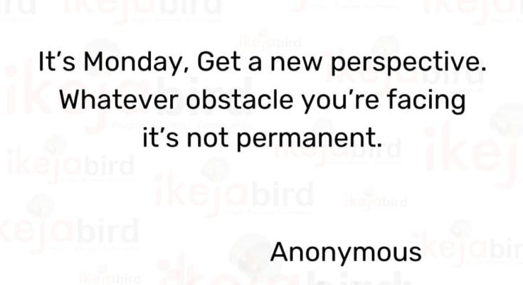 UncategorizedMonday Motivation – Remember, whatever obstacle you are facing isn’t permanent…. June 20, 2022June 20, 2022 - by Ikejabird - Leave a Comment Recommended posts: Monday Motivation – Whatever obstacle you are facing is not Permanent It’s Monday again, be intentional about your actions this week and strive to be the best at whatever you do Monday Motivation Monday Motivation • This Week Treat your mind right and allow only positivity