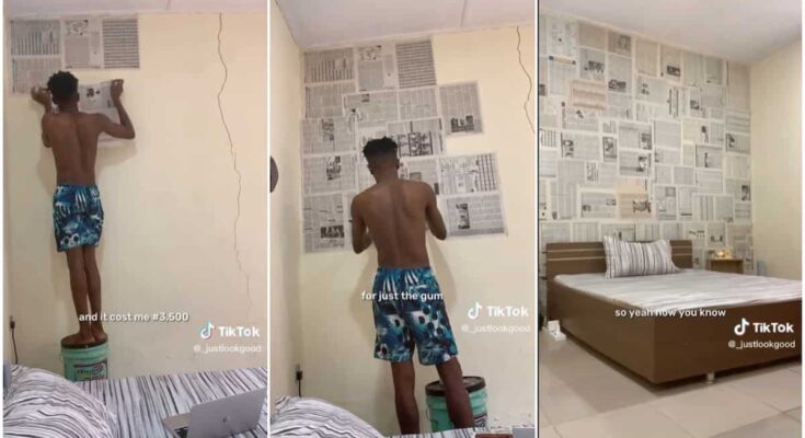 A brilliant Nigerian man showed people how he changed his room to a beautiful one using old newspapers.