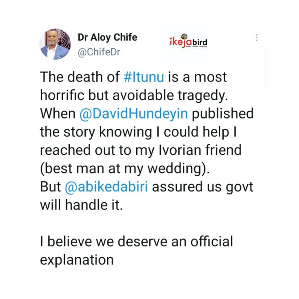 FG demands for full investigation to death of Itunu Babalola, Nigerian lady wrongfully accused in Cote d’ivoire.