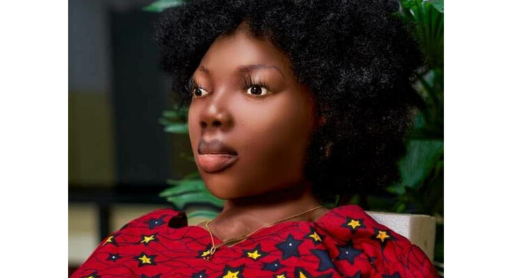 She was dressed in a red Ankara attire with a pulped hairstyle.