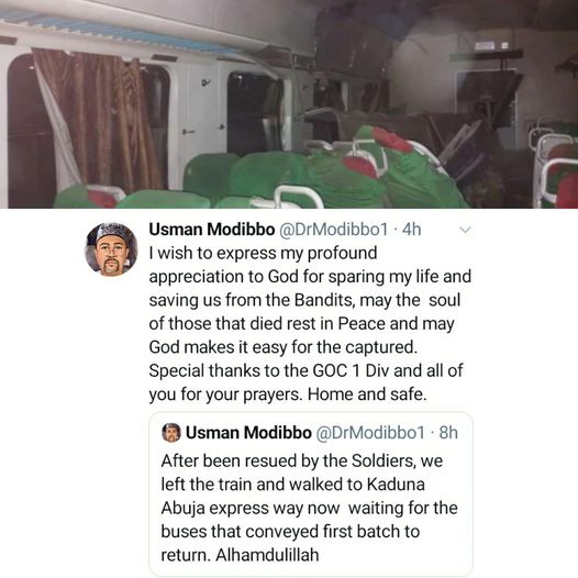 Metro + Crime / NewsPassenger who boarded Abuja-Kaduna train attacked by bandits grateful to God for sparing his life March 29, 2022February 12, 2024 - by Ikejabird - Leave a Comment He confirms that some persons died while others were abducted. Recommended posts: PHOTO NEWS: elrufai visits injured passengers on Abuja-Kaduna train attacked by terrorists Blood donors needed to save the lives of victims of Abuja-Kaduna train attacked by terrorists – Eyewitness Bandits Attack: NDA assures the public of Cadets’ safety. PHOTOS: Vice President, Yemi Osinbajo @ProfOsinbajo visits victims of Abuja-Kaduna train attacked by terrorists