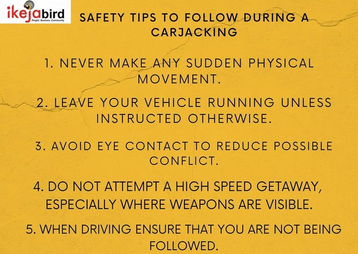 Metro + Crime / UncategorizedSafety Tips to follow during a carjacking June 5, 2021September 14, 2021 - by Ikejabird - Leave a Comment Recommended posts: IKEJABIRD THE RISING SUN..!! Follow us on Instagram for updated news, information, eventories etc. Flood takes over road, Afijalo market in Oshodi as students scamper for safety. Bandits Attack: NDA assures the public of Cadets’ safety. Tips to avoid fake recruiters.