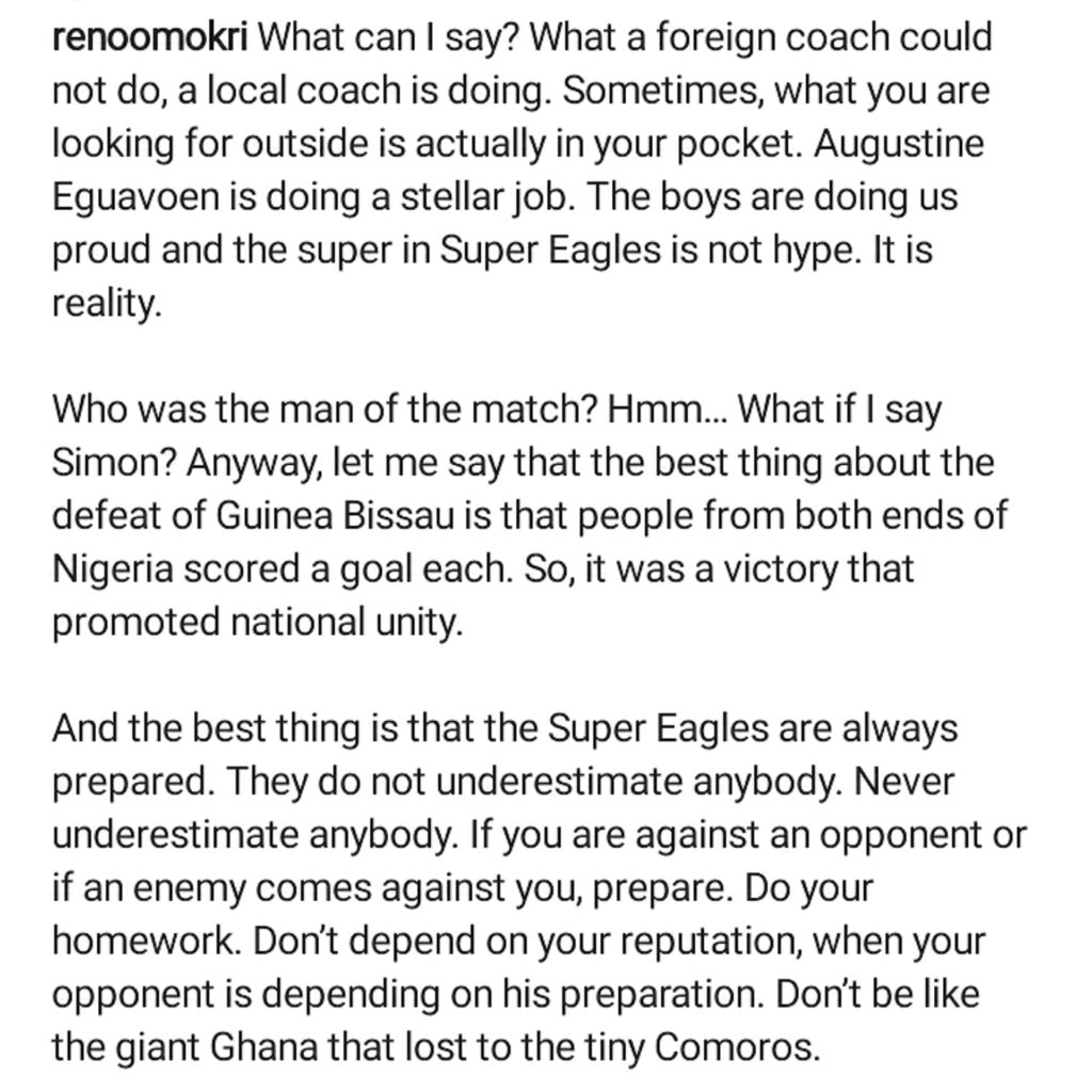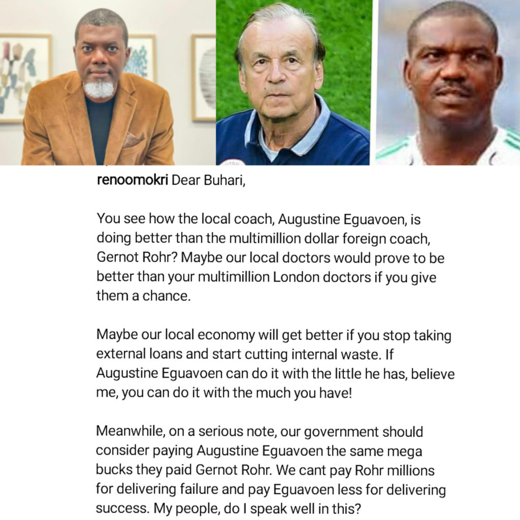 The local coach is doing better than the multimillionaire dollar foreign coach – Reno Omokri salutes Super Eagles Coach after the defeat of Guinea-Bissau