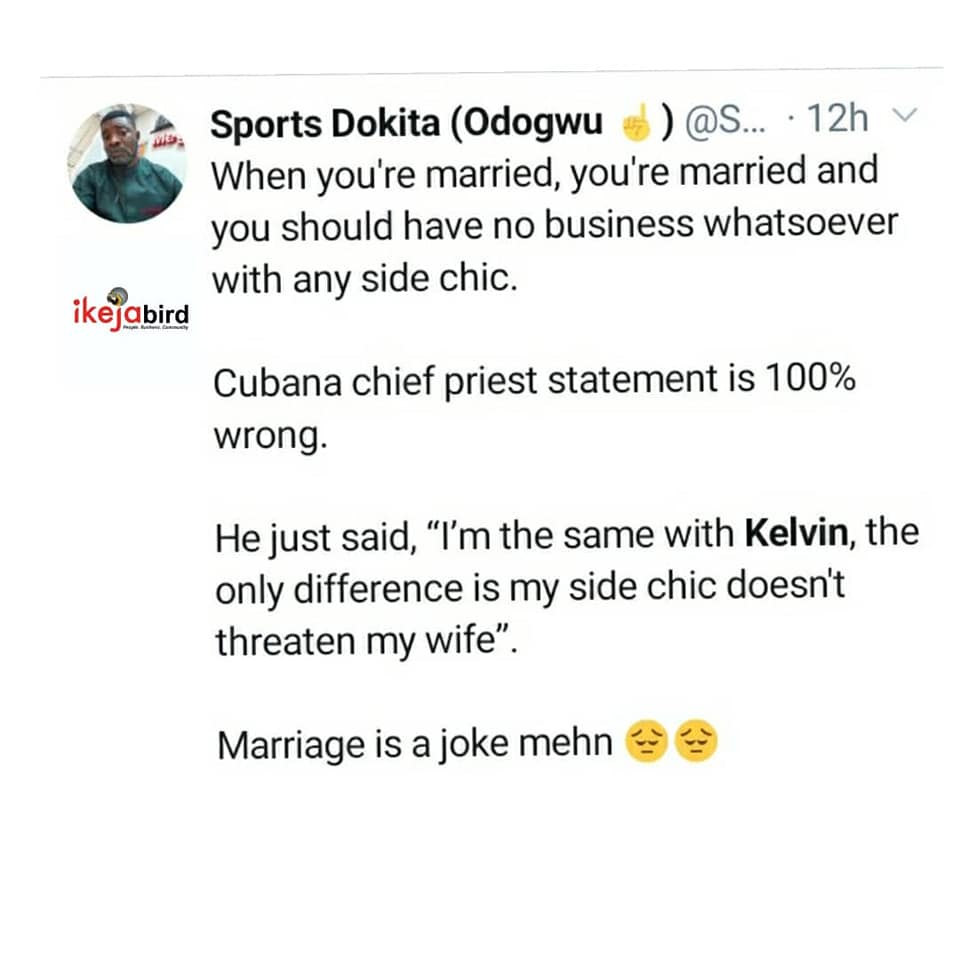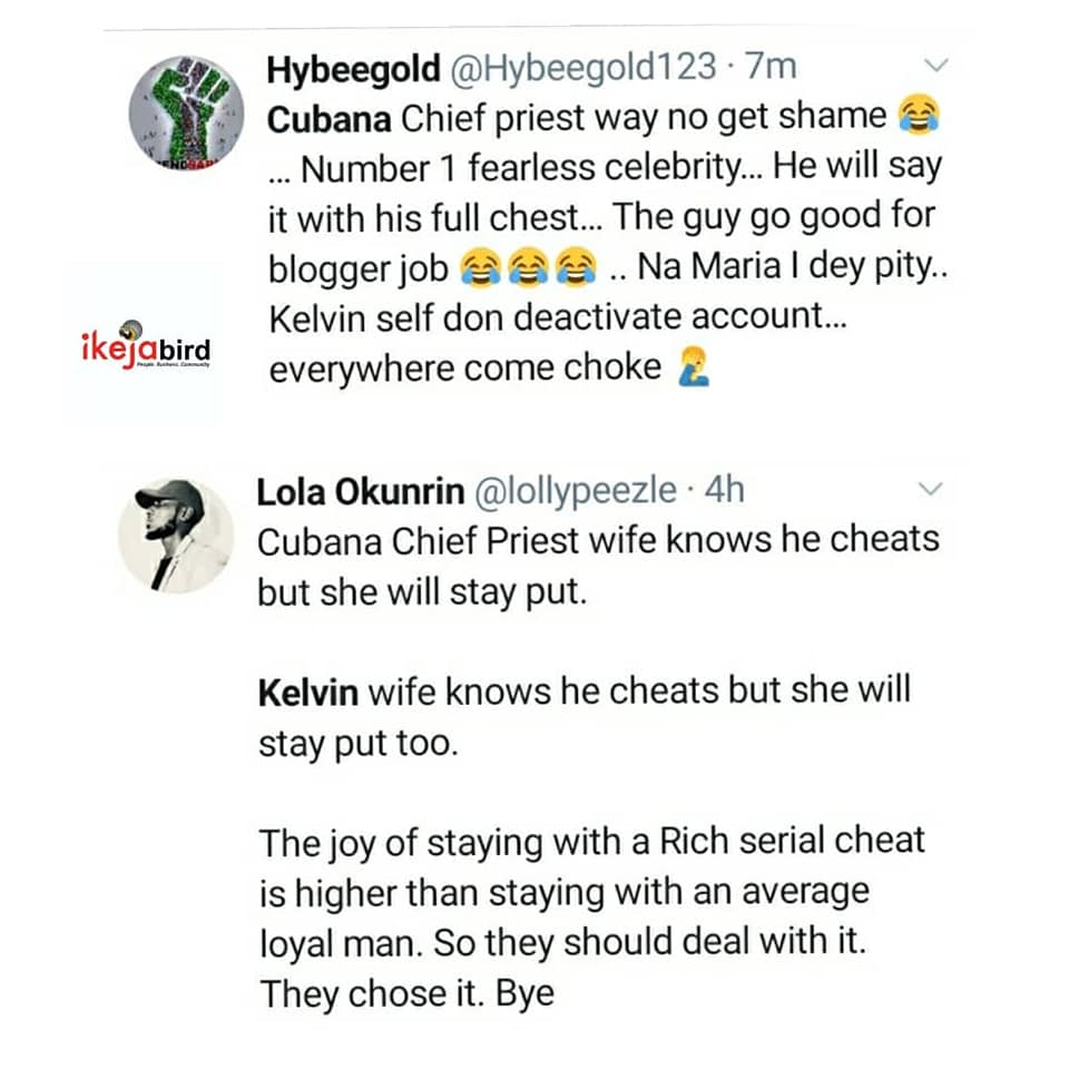 If we begin talk wentin your so called sister dey do inside her marriage for public everywhere for scatter. – Kelvin’s brother fires back at Cubana Chief Priest.
