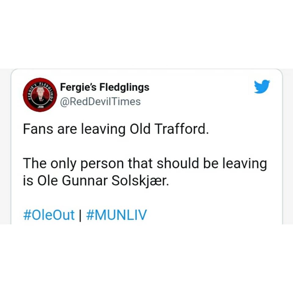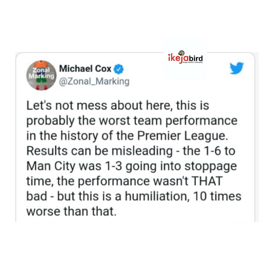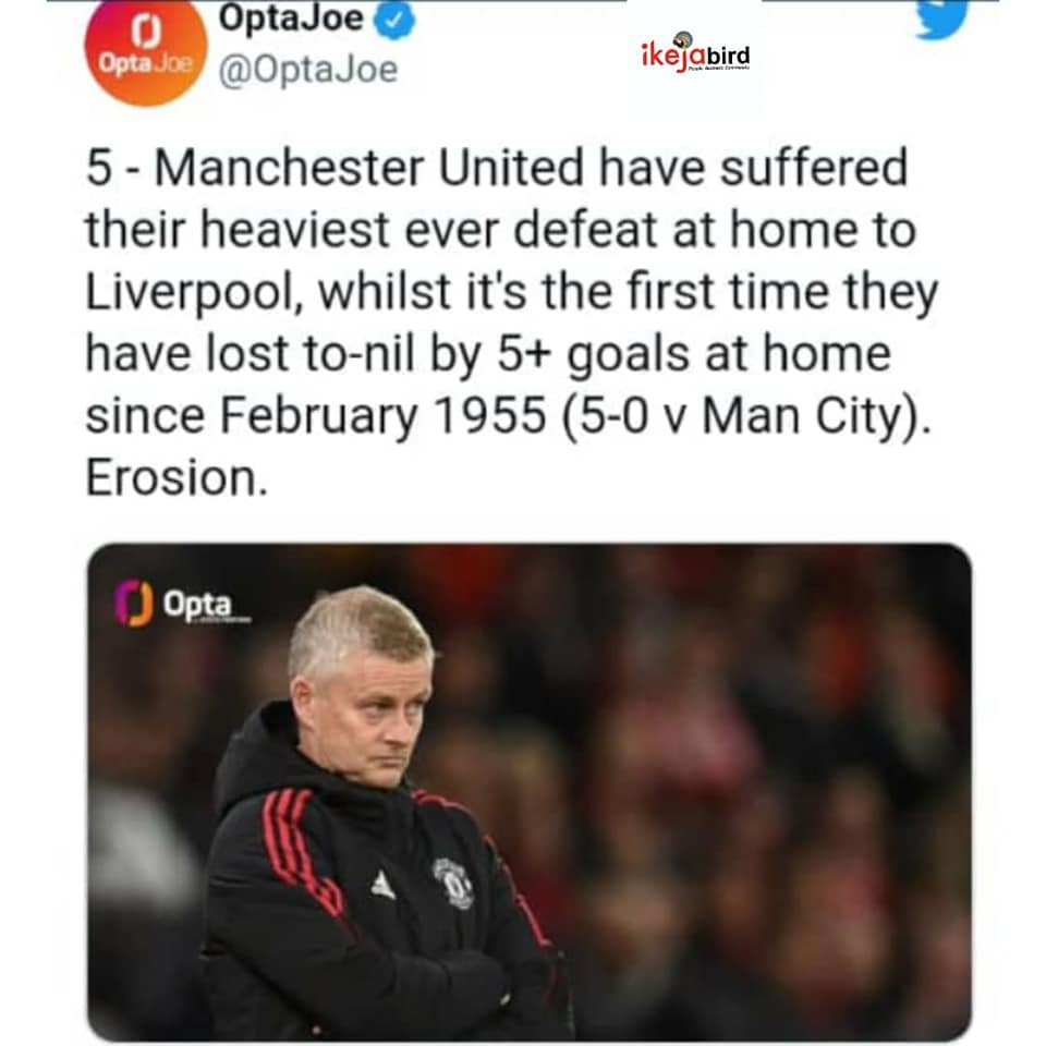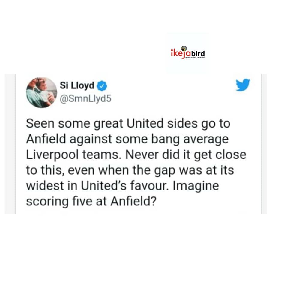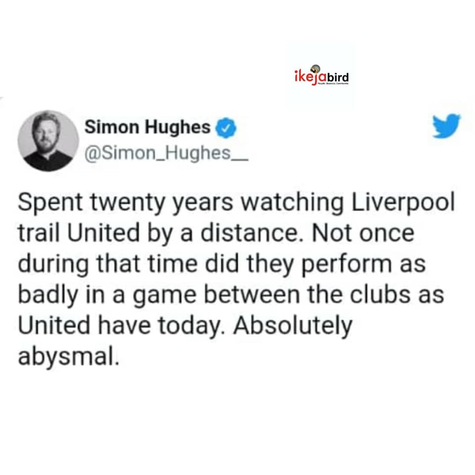 SportsTWITTER USERS REACTS TO MAN UTD HUMILIATION @ HOME TO LIVERPOOL..π October 25, 2021December 7, 2021 - by Ikejabird - Leave a Comment IKEJABIRD ποΈ SPORTS β½π₯ TWITTER USERS REACTS TO MAN UTD HUMILIATION @ HOME TO LIVERPOOL..π Recommended posts: WEEKEND SPORTS REVIEW..ππ₯π₯ Man Utd fans want Solskjaer sacked for humiliating collapse against Liverpool..ππ WEEKEND SPORTS REVIEW..π₯β½π₯ Twitter Ban: Nigeria Losing N90 million Every Hour