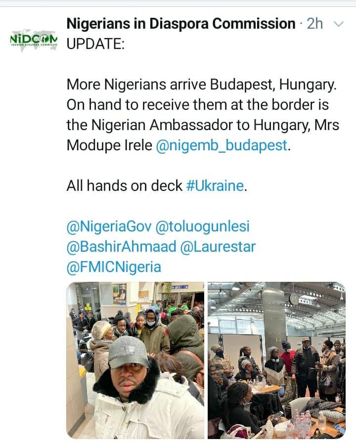 Hot TopicsUkraine/Russia Crisis: Update from Nigerians in Diaspora Commission March 1, 2022March 1, 2022 - by Ikejabird - Leave a Comment Recommended posts: Ukraine-Russia crisis Update:.. Ukraine/Russia Crisis: Fed Govt plans to evacuate Nigerians by Wednesday Nigeria’s Foreign Minister, Onyeama, ignores question by a journalist to comment on the Russia-Ukraine crisis, Update on Ukraine Crisis