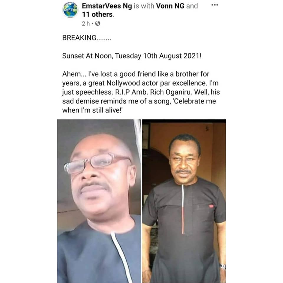 EntertainmentVeteran Nollywood actor, Rich Oganiru is dead. August 11, 2021September 15, 2021 - by Ikejabird - Leave a Comment He died on Tuesday after battling with sickness for months. Recommended posts: Nollywood actor, Stanley Rabbi O. is dead. Chairman of Eti-Osa Lagos Council, Olufunmi Rafiu Olatunji is dead. Veteran actress Stella Damasus singing with her grown daughters King of Boys: The Return of the King (A Nollywood Classic)