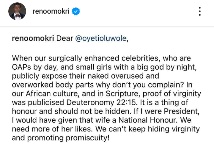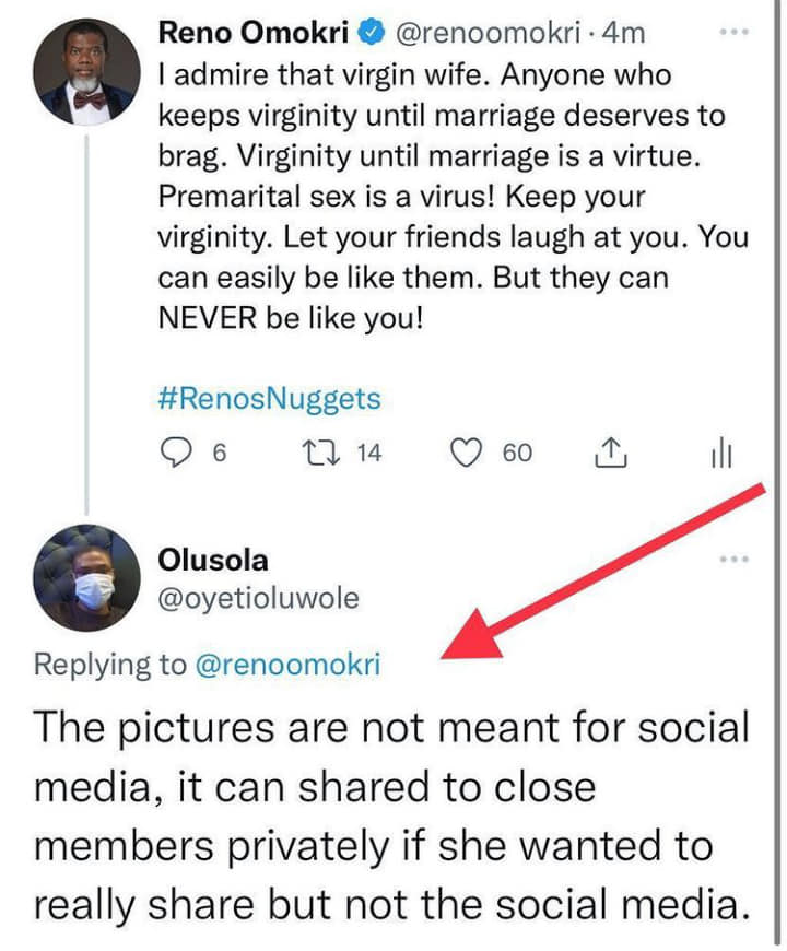 When immorality is publicized, then morality should be much more publicized – Reno Omokri reacts to objections that the virgin bride should keep the pictures private.
